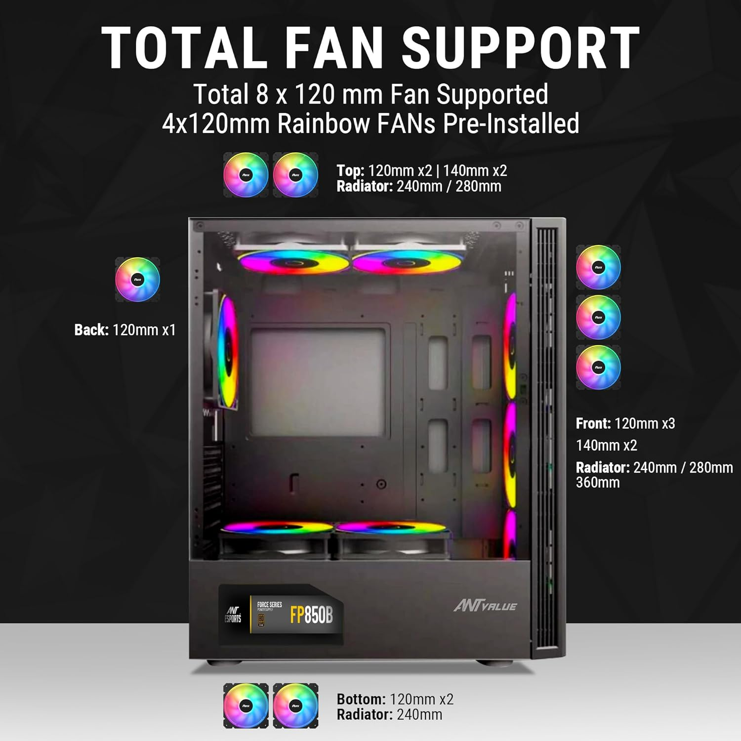 Ant Value VM40 ATX Computer Case/Gaming Cabinet - Black | Support ATX, M-ATX, ITX | Pre-Installed 3 Front & 1 Rear Rainbow Fans