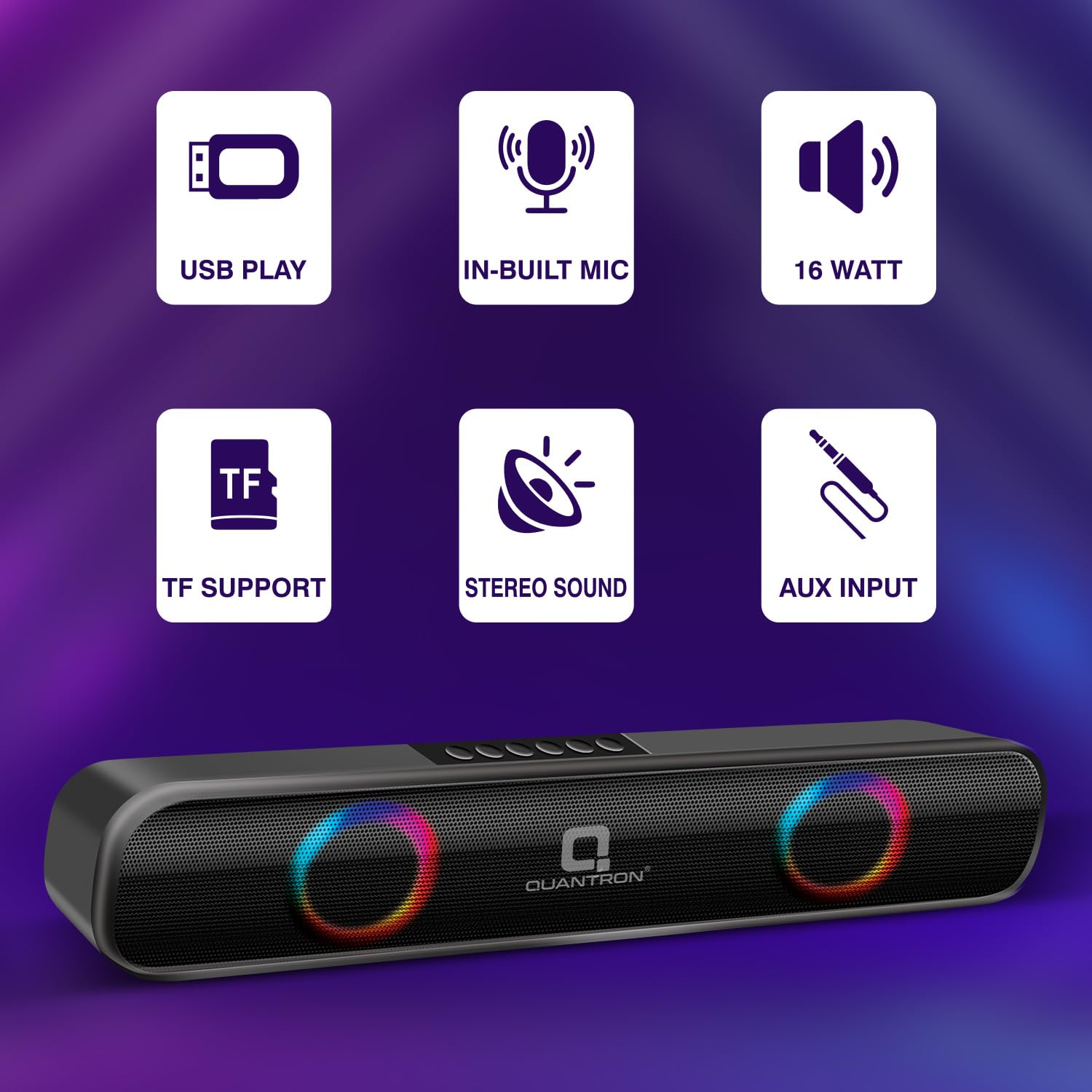 Quantron Wireless Soundbar QWS-1217, Portable Bluetooth Speaker, 16 Watts, Upto 10h Backup, 52 mm Drivers, Call Function, Bluetooth v5.1 | USB | mSD| AUX, TWS, RGB LED