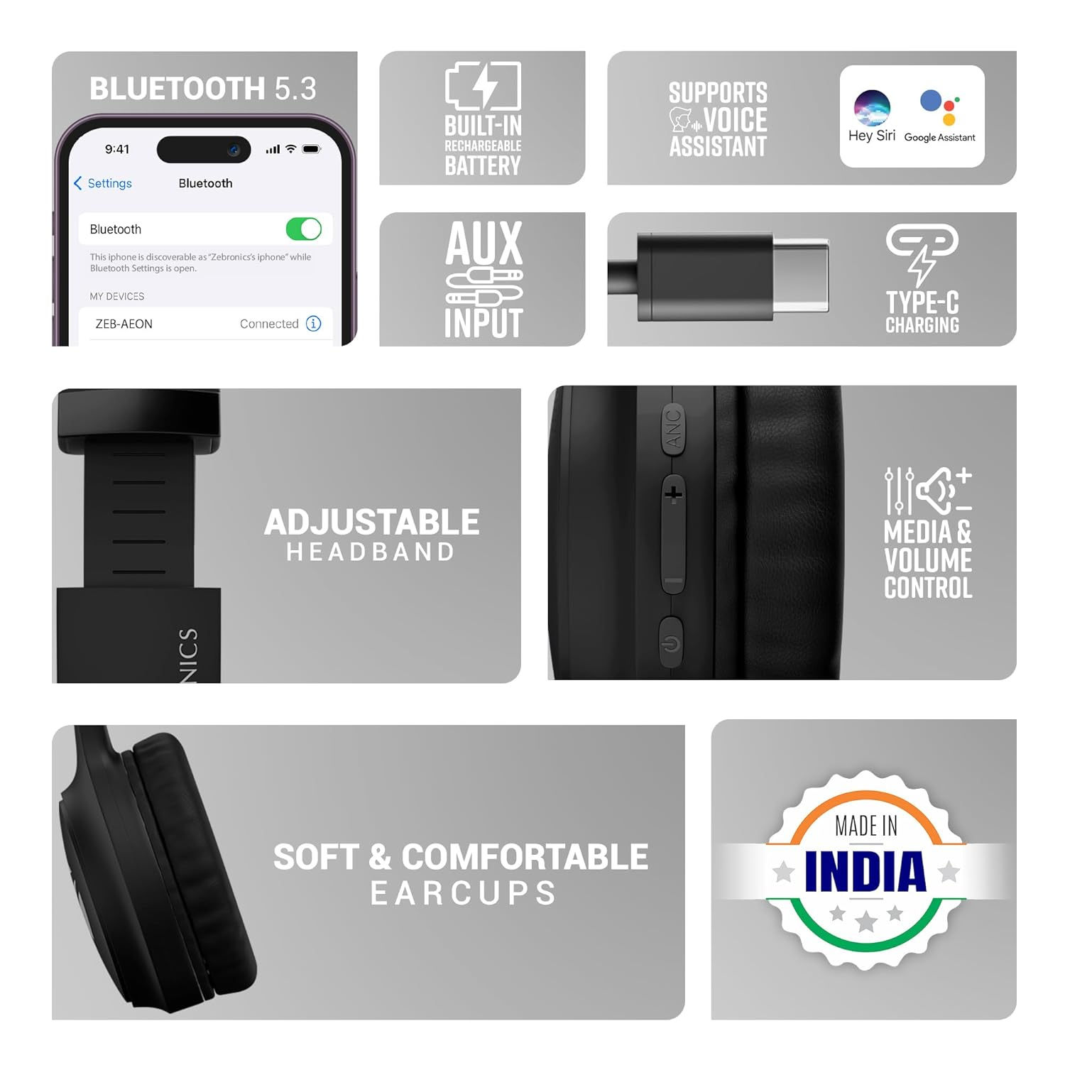 ZEBRONICS AEON Over Ear Wireless Headphone with 110h Battery Backup, Supports Bluetooth & AUX, Gaming Mode, ENC, Dual Pairing, Rapid Charging (Black)