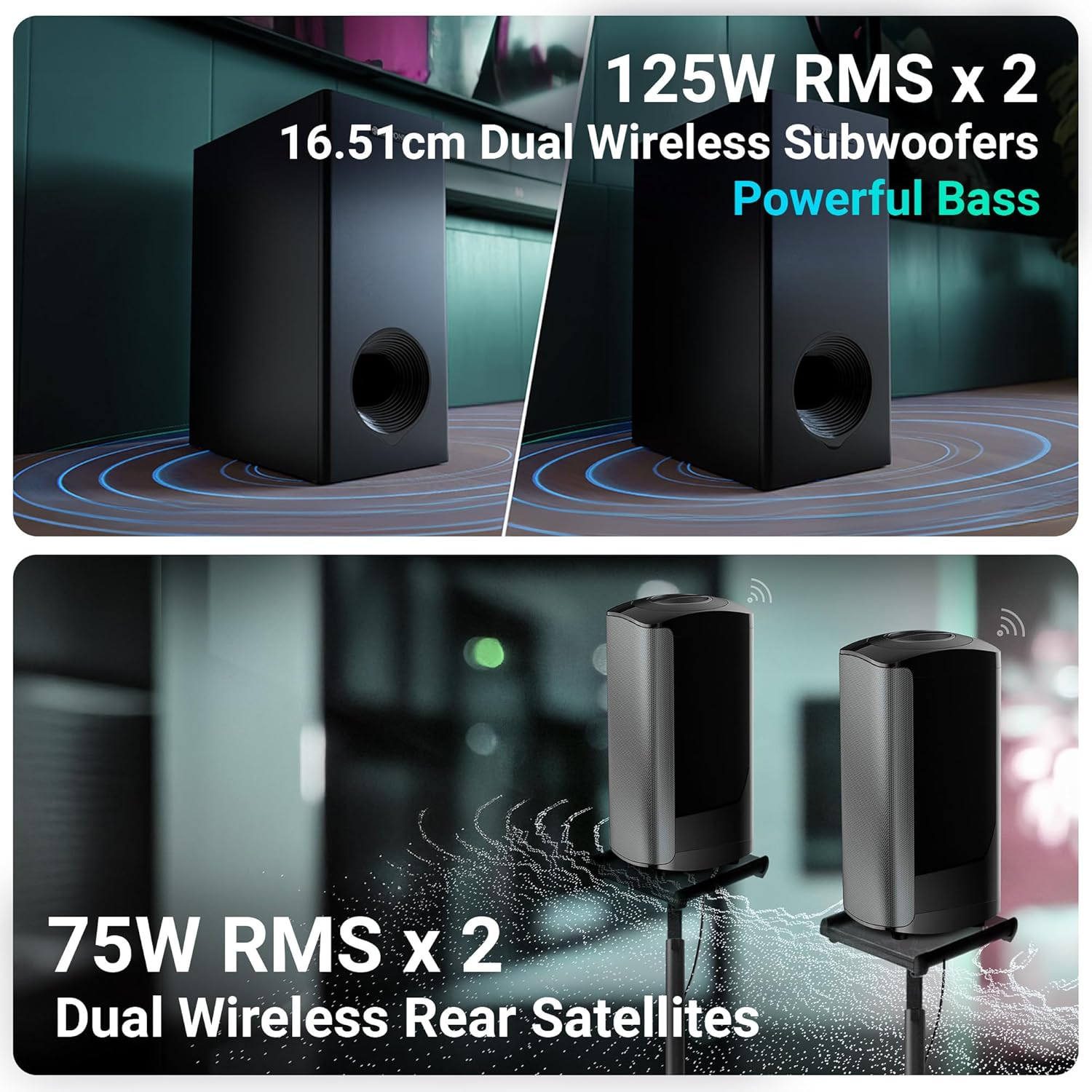 ZEBRONICS Juke BAR 9552, Dolby Audio, Dual Wireless Subwoofer & Satellite, 625 Watts, RGB LED, Bluetooth Soundbar (Black, 5.2 Channel)